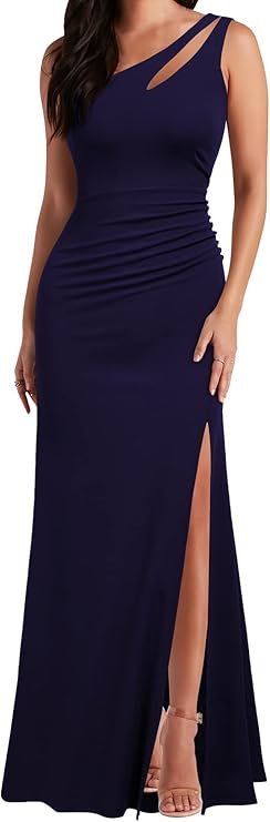 Long sleeveless evening dress with one shoulder. Bodycon cut with leg split and small chest cutout. Very suitable for summer cocktail parties or vacations.