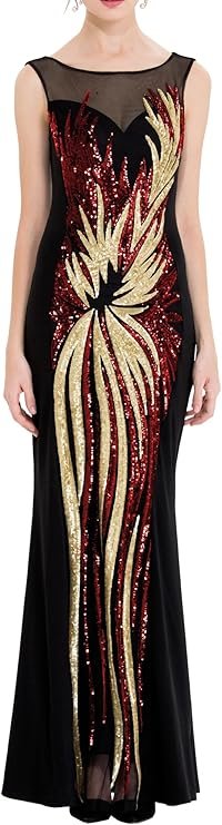 Dress combining black fabric with gold and red geometric sequin embroidery. The top part is sheer to add a sophisticated feminine touch. Contains a built-in bra.