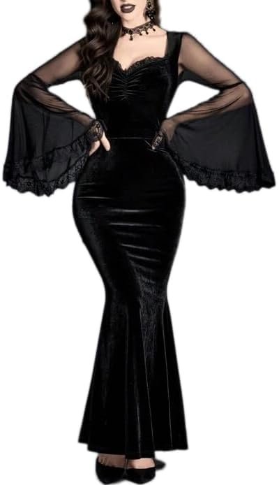 Gothic vintage style dress combining soft velvet and mesh. Features very wide Flare Sleeves and side splits. The cut enhances the hourglass figure.